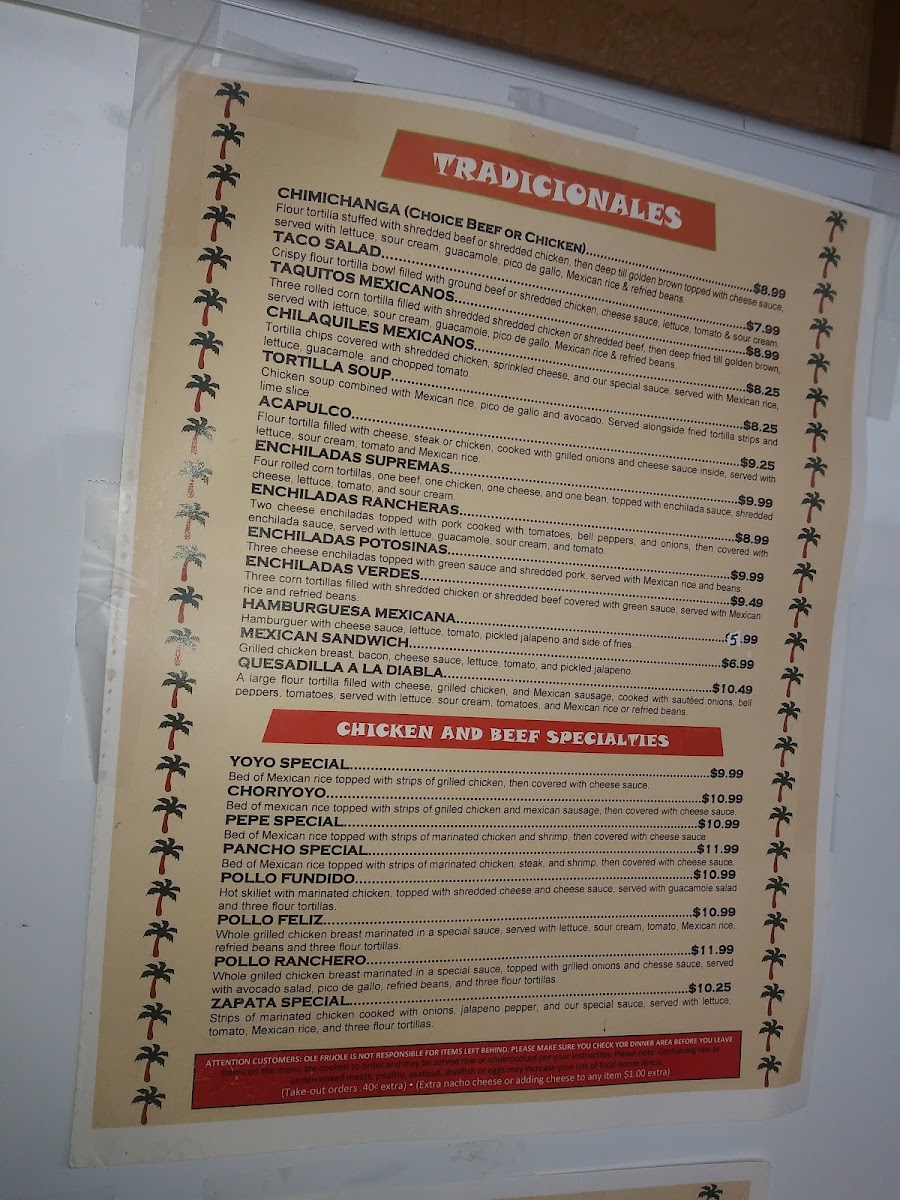 T-bone steak served with Mexican rice, refried beans, one cheese enchilada, one beef tostada, French fries, and three flour tortillas.