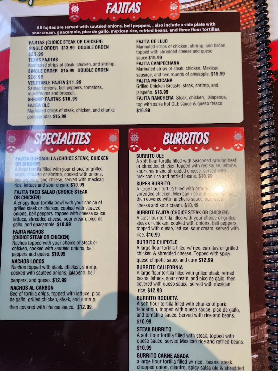 Strips of steak cooked in a spicy ranchero sauce, served with Mexican rice, refried beans, and three flour tortillas.