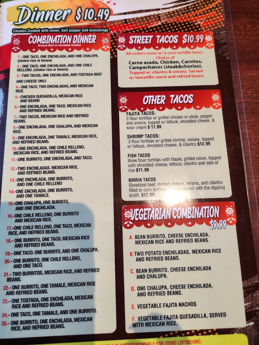 Three rolled corn tortilla filled with shredded chicken or shredded beef, then deep fried till golden brown, served with lettuce, sour cream, guacamole, pico de gallo, Mexican rice & refried beans.